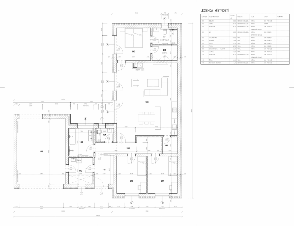- keramická dlažba – garáž, zádveří, koupelny, toaleta, technická místnost
